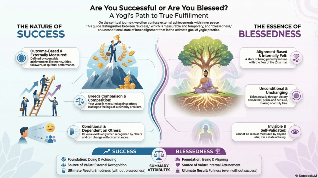 Success and Blessedness A Fundamental Distinction on the Yogic Path On the spiritual path, there is a very subtle confusion โa confusion between success and blessedness. Most of us equate the two. We see people who are successful in life โ good health, career, family, recognition, even spiritual accomplishments โ and we say, โYou are